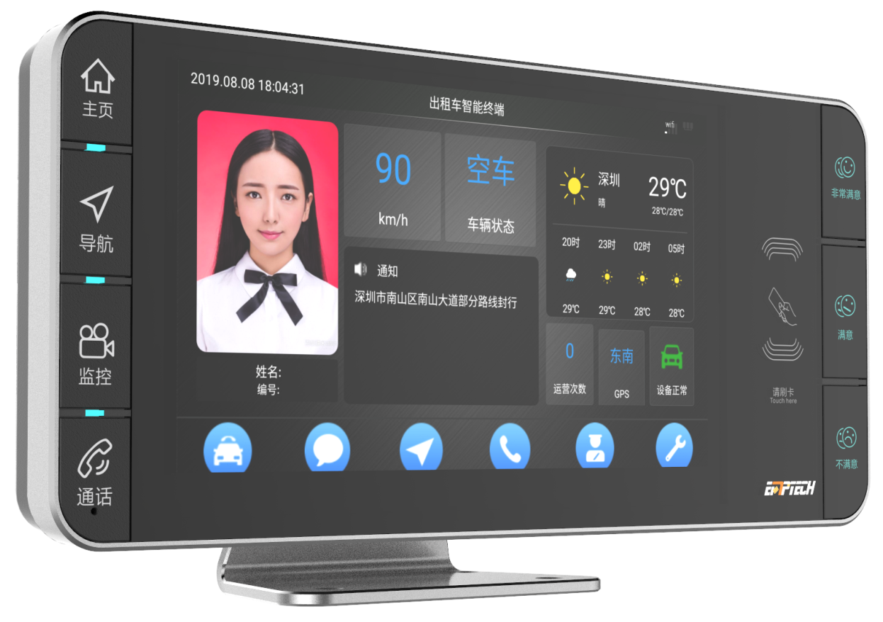 UG环球视讯ug出租车车载智能终端基于Android操作系统,采用大屏嵌入式安装,由液晶显示区、状态显示区、星级显示区、服务评价区等组成,设备可安装给予网约化服务的APP应用,具有人机互动、视频播放、查看短信、电子证件显示、网约服务接单、扫码支付、智能导航、语音播报、服务评价等功能,并支持接入不同厂家的出租车基础硬件设备。